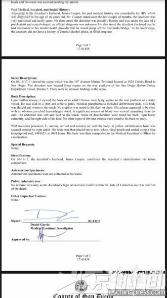 直到来自圣地亚哥县验尸官办公室出具了详尽的尸检报告,种种疑惑才得以解释。据尸检报告显示,曾以友人身份接受媒体采访的James Cooper是赵义宁的丈夫,当赵的尸体被警方打捞上来之后,Cooper指认了赵义宁的身份,并通过赵义宁身上的纹身确定了死者就是他(Cooper)的爱人——赵义宁。