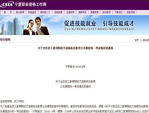 宁夏自治区劳动保障厅要求各技工院校从2008年秋季新学期开始,把艾滋病防治教育课程列入公共课程。尽管各院校采取的形式不同,有的是专题讲座,有的是班会,有的是德育课等,但都在日常教学课程安排之列,完成并且大多超额完成规定的课时数。