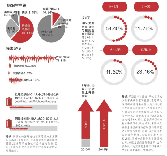 艾滋病患者若不接受抗病毒治疗,平均存活时间是12~18个月。在东莞,无论是本地人,还是外地人,均可享受零门槛的免费艾滋病治疗。数据显示,从2010年开始,东莞加入到抗病毒治疗的艾滋病例出现大幅增长,东莞市疾控中心专家统计2010~2014年在莞治疗的1412名艾滋病例发现,人群主要以青壮年、外省户籍为主。