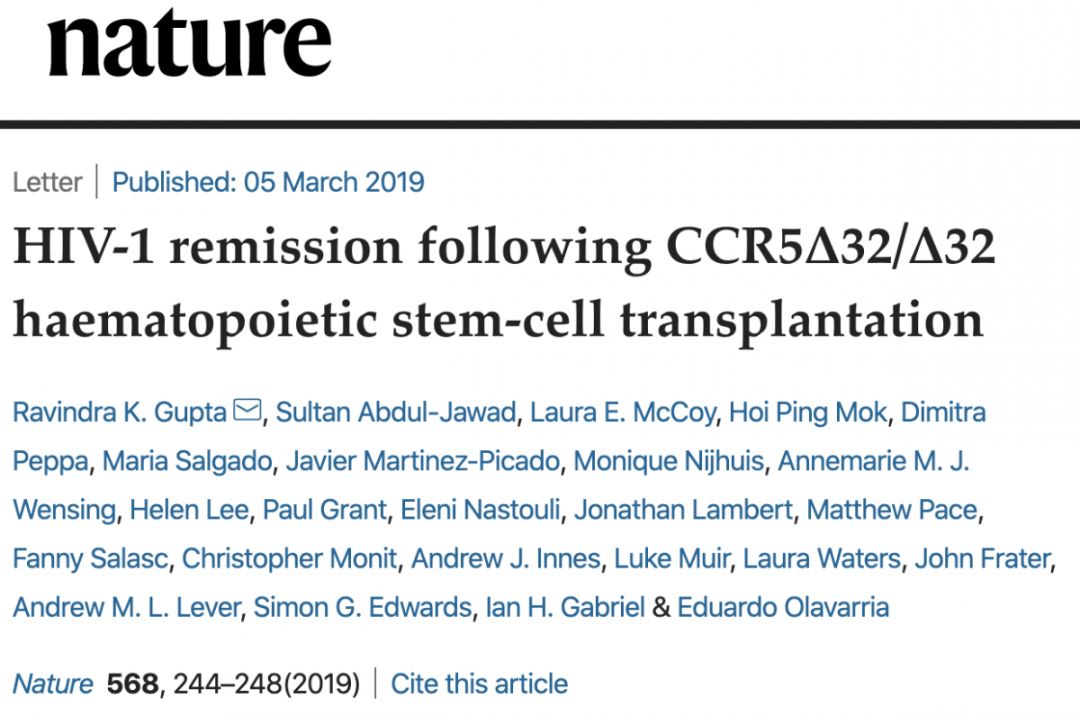 2.Gupta, R.K., et al., Evidence for HIV-1 cure after CCR5Δ32/Δ32 allogeneic haemopoietic stem-cell transplantation 30 months post analytical treatment interruption: a case report. Lancet HIV, 2020.