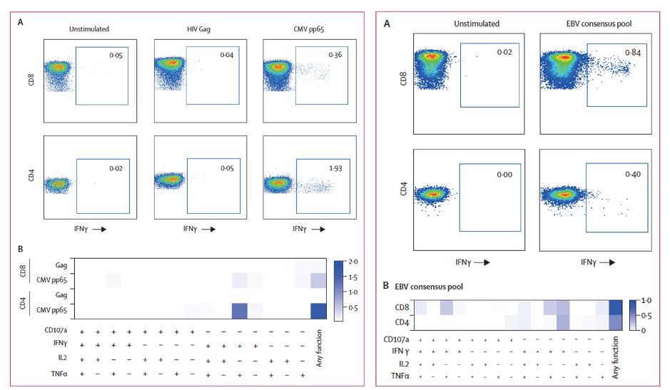 研究人员随后检测了患者体内 CD4 和 CD8 T 细胞对 HIV gag, EBV 和 CMV 的特异性免疫反应。发现患者的 T 细胞只对 EBV 和 CMV 产生免疫应答,而对 HIV gag 无响应。图源:Lancet HIV