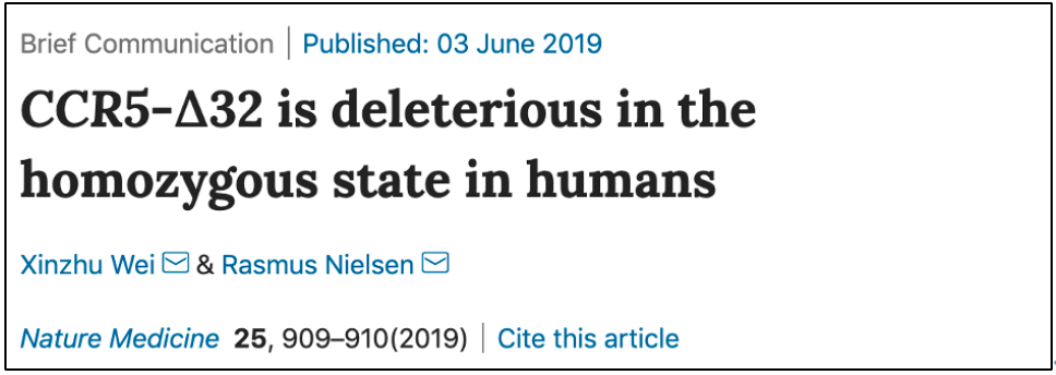 3.Wei, X. and R. Nielsen, CCR5-∆32 is deleterious in the homozygous state in humans. Nature Medicine, 2019. 25(6): p. 909-910.
