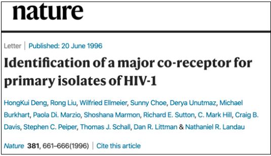 但布朗和他的医生并没束手就擒,来自柏林的医生 Gero Hütter 决定进行一次大胆的治疗,他从 60 名骨髓捐赠者中挑选出一名特殊的捐赠者,这名捐赠者携带 CCR5-Δ32 突变。CCR5 此前被现北京大学邓宏魁教授证明是 HIV 病毒侵入 Τ 细胞的主要受体。有 1% 的欧洲人天生携带 CCR5-Δ32 的突变。后来的研究发现,这种突变让他们先天对 CCR5 (R5) 嗜性 HIV 病毒免疫。邓宏魁教授此前相关论文,图源:Nature
