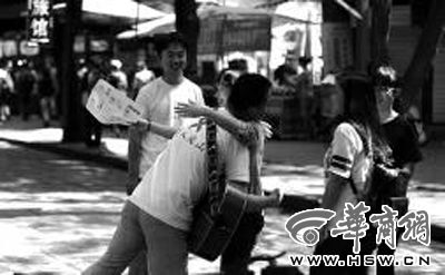 昨日,来自湖南邵阳的戴女士和彼得拥抱 本报记者 黄利健 摄本报讯(记者李小博)“我们就是想在5月18日国际艾滋病烛光纪念日当天,征集愿意和我们一起爬华山的人,宣传艾滋病病毒不会通过日常接触传染。”昨日,志愿者程帅帅和两名艾滋病病毒携带者出现在鼓楼附近,穿着印有“请人爬山”字样的T恤,并向路人发放宣传单。90后的程帅帅此前在河南开办“艾滋公寓”,“这两名携带者都是在公寓里住过以后认识的。”程帅帅说,到时候公寓里还会有几名携带者一起参加活动。“他们其实对生活更热爱也更乐观,我们就是为帮助他们努力地活下去。”